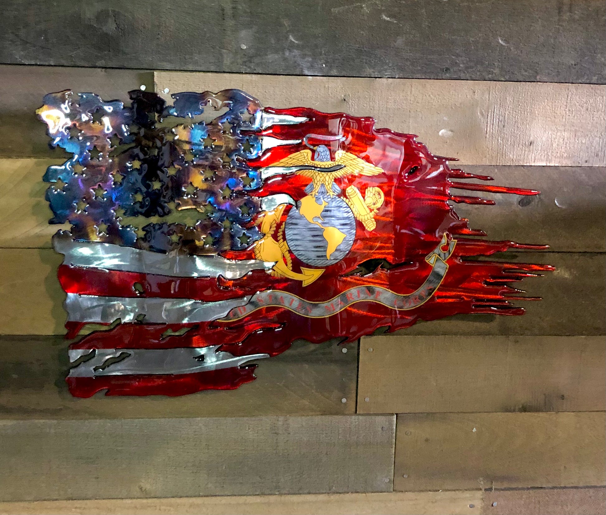 A bold tribute to honor, courage, and commitment—this handcrafted steel sculpture features the iconic Eagle, Globe, and Anchor, symbolizing the Marine Corps’ unwavering mission to defend the United States by air, land, and sea.